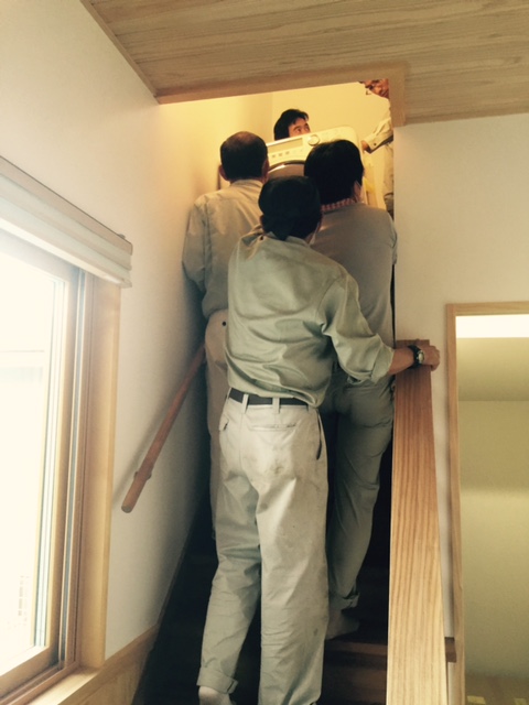 サイズ的には通るのですが、重いのと狭いのと、まわり階段となりまして苦戦しました。