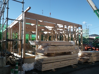 ブログBLOGH様邸建方。2016.01.19いよいよH様邸の建方となりました! 昨日の雪かきの成果もあり、朝一からスムーズに作業に入れました。 天気も良く、建方日和となりました。 今日の作業で母屋まで組み上がり、建物全体のボリュームが出現しました。 今まで基礎しかなかった現場に躯体が組み上がると、お施主様にとっては、ますます「家」という実感が わいてくると思います。 何もないところから、今まで考えてきたプランが実際に造られていくのは楽しみですね。 建方も無事終わり、明日からの作業も順調に進めていきたいと思います! (山中)BACK