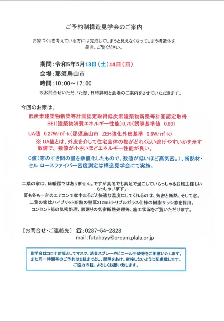 ご予約制構造見学会のご案内 – 5月13日(土)14日(日)in 那須烏山市 | 栃木県のC値、UA値に優れ光熱費、電気代の少ない二葉の家